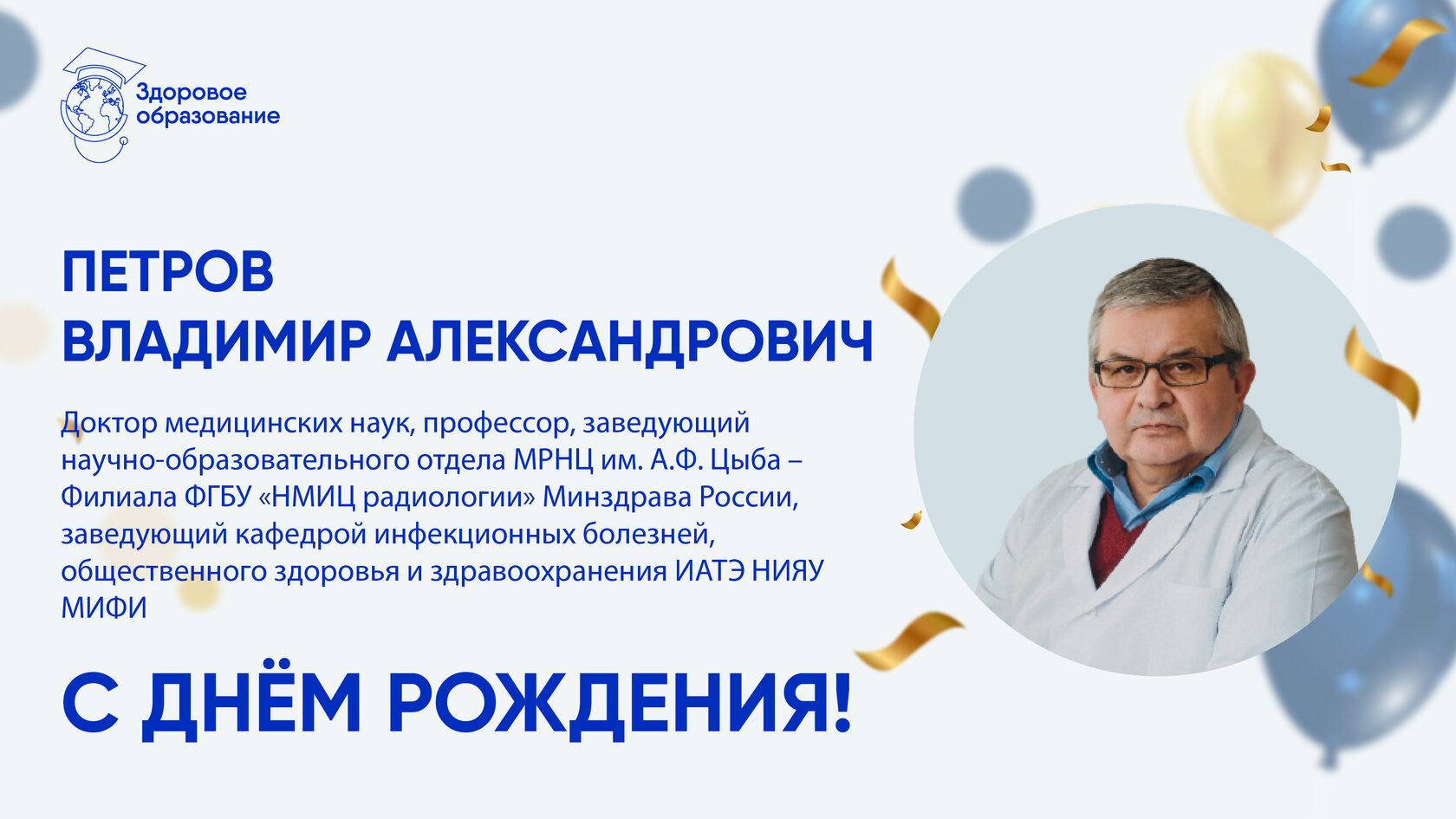 Сегодня свой день рождения празднует Петров Владимир Александрович, доктор медицинских наук, профессор, заведующий научно-образовательного отдела МРНЦ им. А.Ф. Цыба – Филиала ФГБУ «НМИЦ радиологии» Минздрава России, заведующий кафедрой инфекционных болезней, общественного здоровья и здравоохранения ИАТЭ НИЯУ МИФИ.